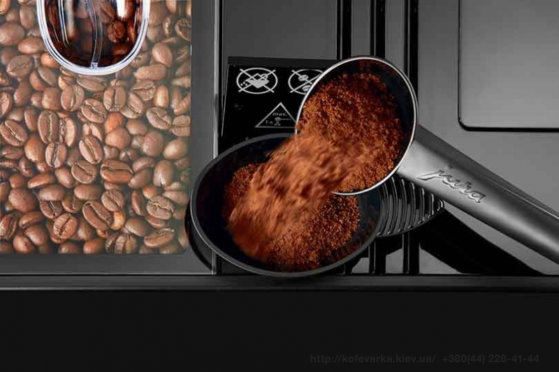 Jura Ena 5 Micro Silver Aroma автоматически переключается на приготовление напитков из готового помола кофейных зерен при закладке молотого кофе в специальный отсек. При этом, можно готовить как одну порцию, так и две порции одновременно, заложив соответствующее количество отмерянного мерной ложкой молотого кофе. Эта опция будет востребована в случае необходимости приготовления порции эспрессо без кофеина без надобности освобождать бункер кофемолки от уже засыпанного в него кофе в зернах.